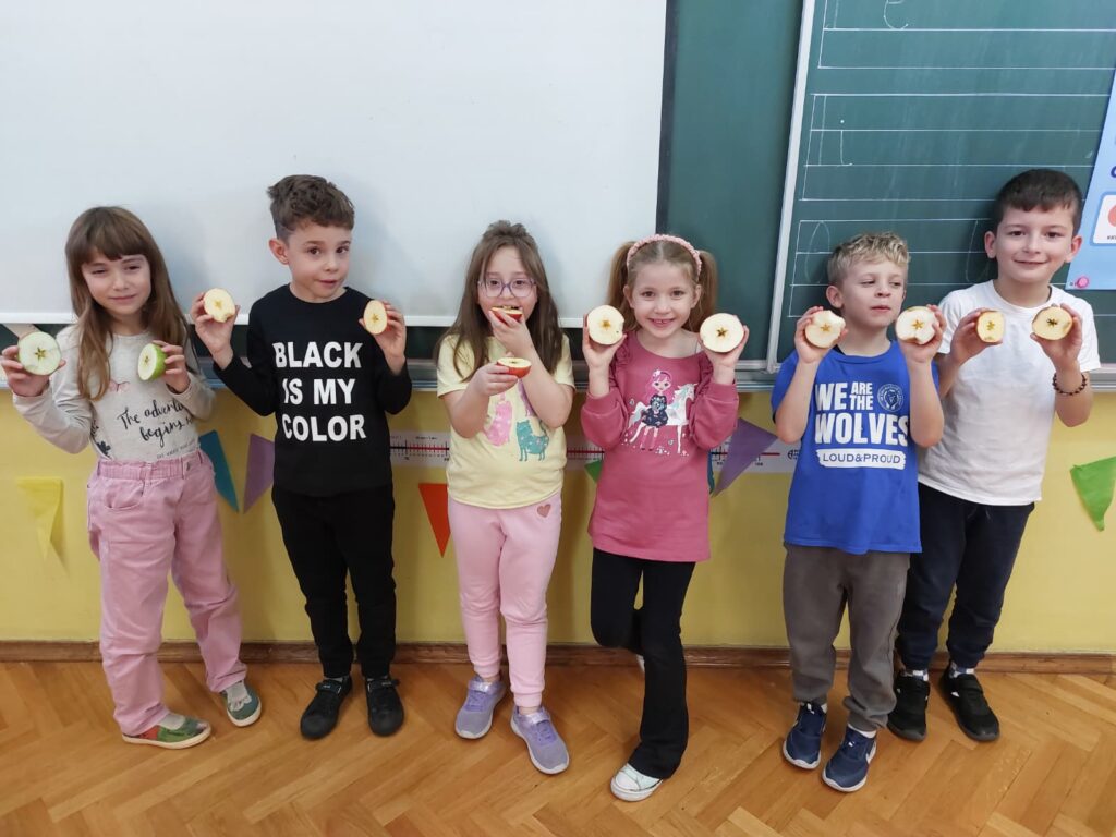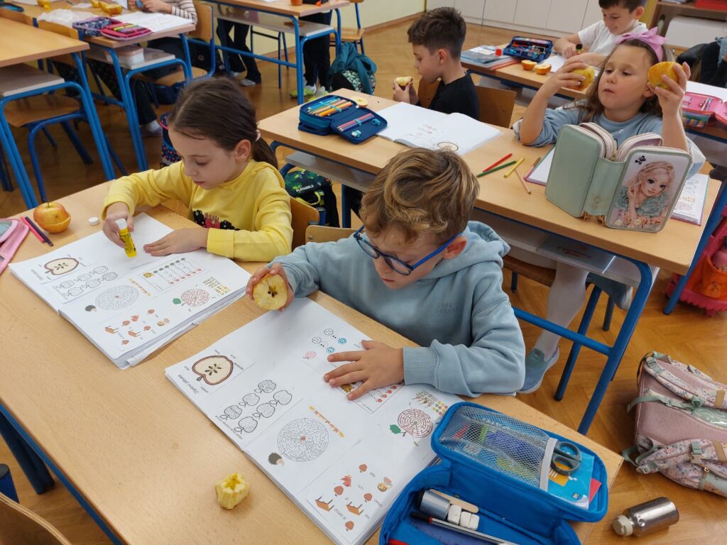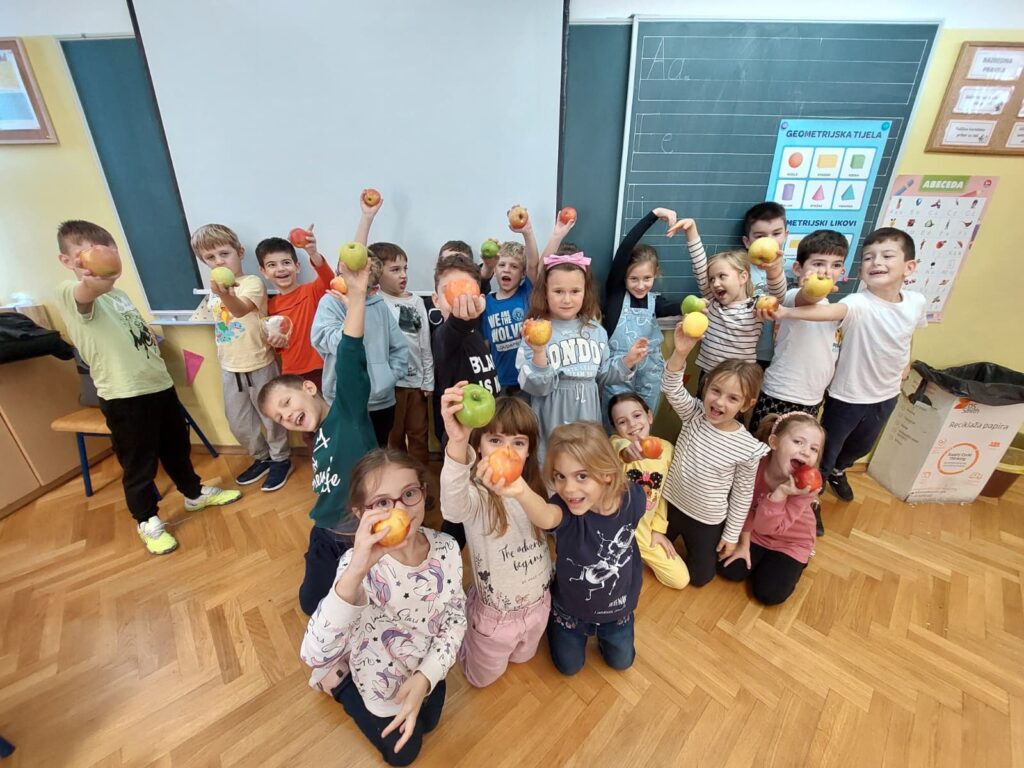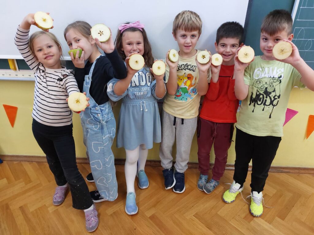 Učenici 1. c u razdoblju od 20. 10. 2025. do 24. 10. 2025. u produženom boravku s učiteljicom Matejom Bizomec sudjelovali su u međunarodnom projektu Dani jabuka – Dani zdrave hrane 5.
